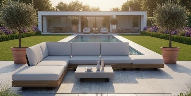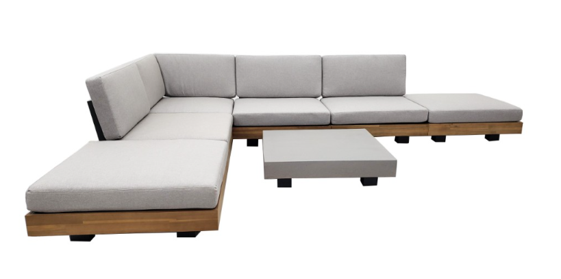 Luxe Los Angeles lounge-hoekset, 7-delig: 3 middenmodules, hoekmodule, 2 voetenbanken en tafel 83×83×21,5 cm. Poedergecoat aluminium (anthraciet), acaciahout in lichte teak-look, polystone betonlook. Comfortabele zit- en rugkussens in Royal Stone Grey 240.