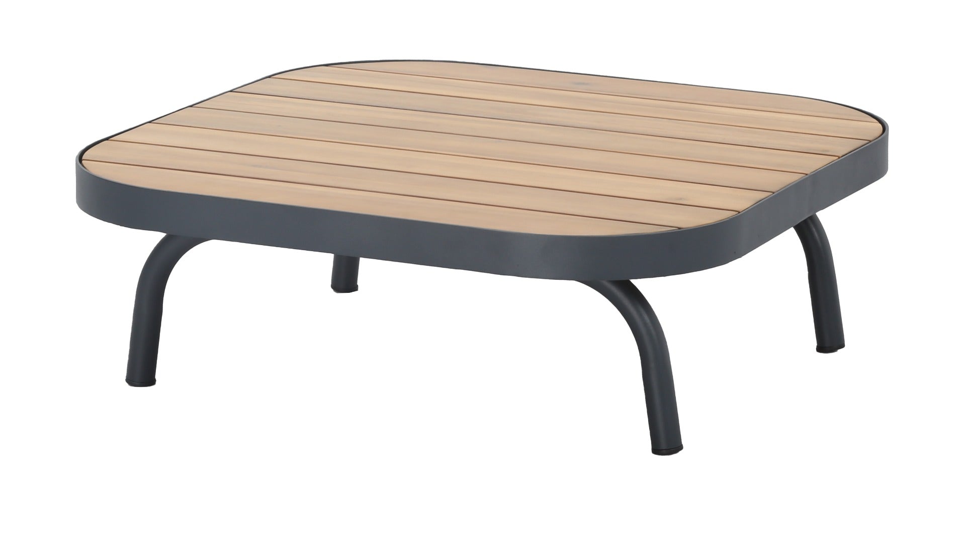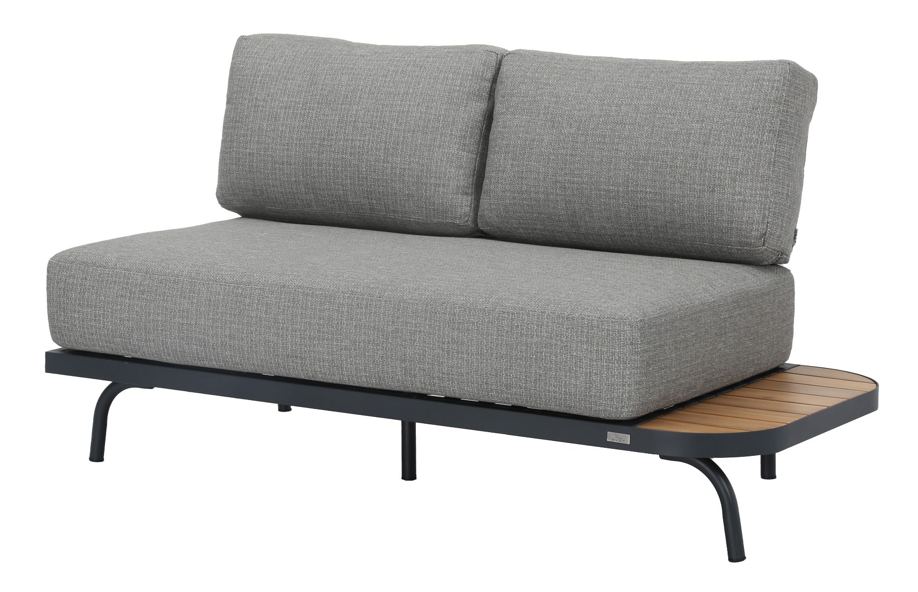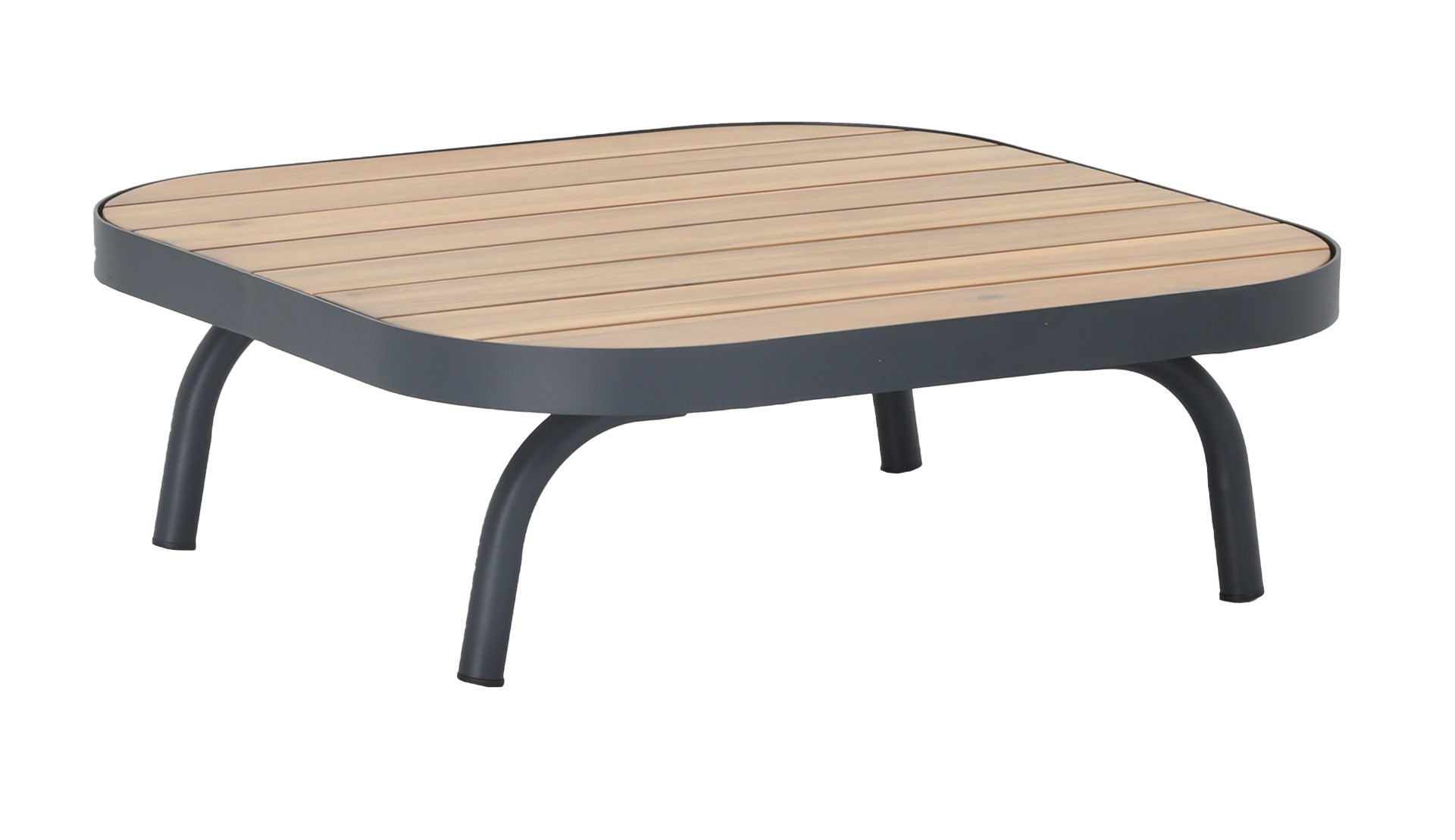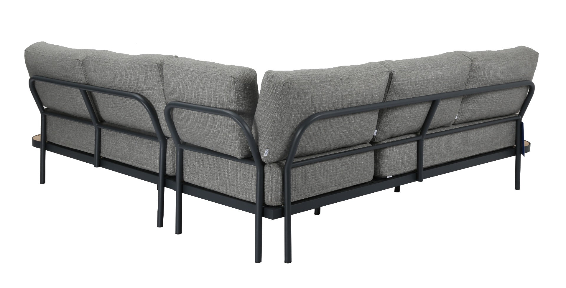Porto lounge hoekset: robuust gepoedercoat stalen frame in antraciet (RAL 7016) met licht teak-look acaciahout. Inclusief comfortabele Fontelina C/168 zit- en rugkussens. Strak design, weerbestendig en duurzaam — perfect voor ontspannen, stijlvolle buitenruimtes.