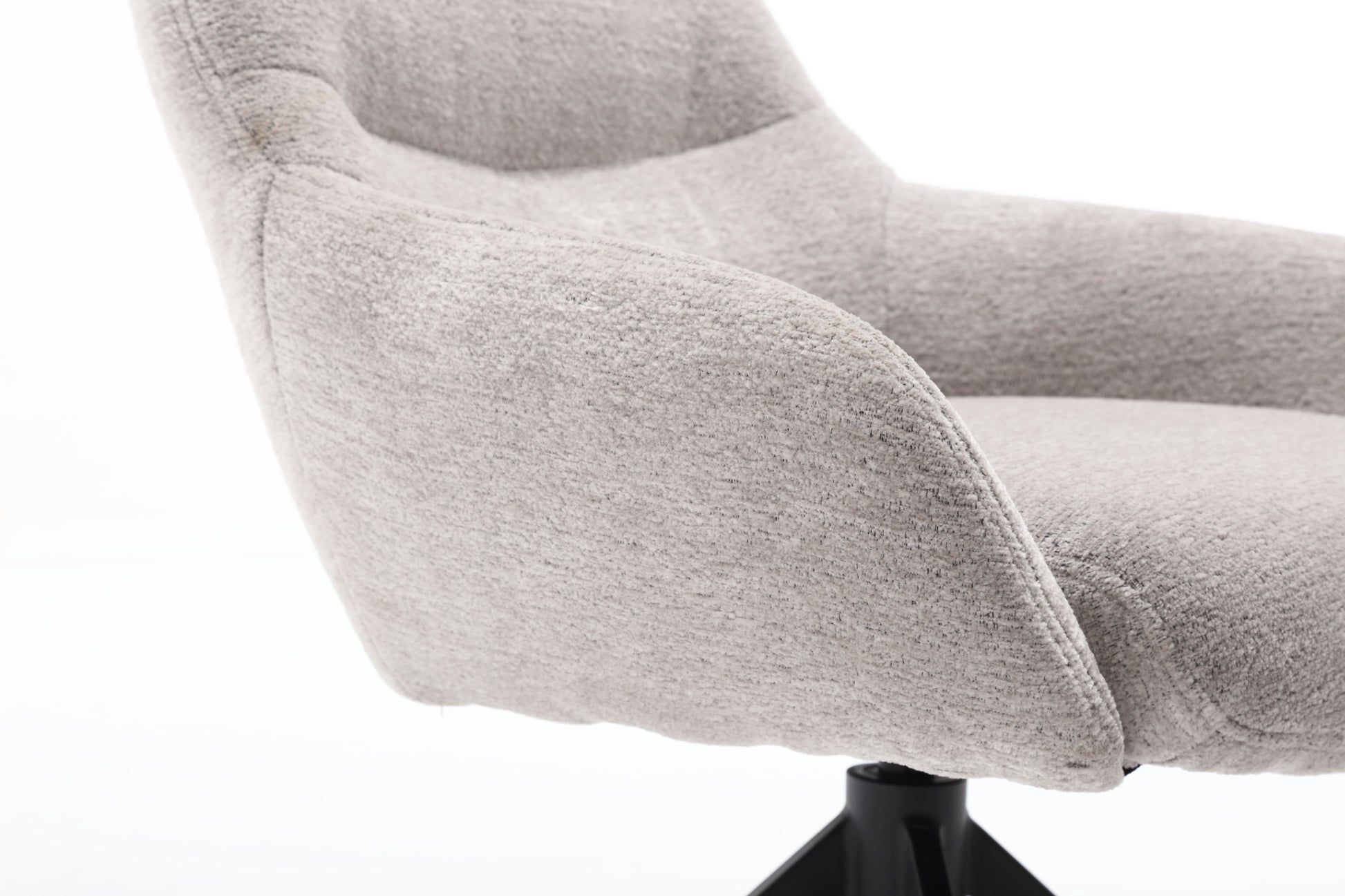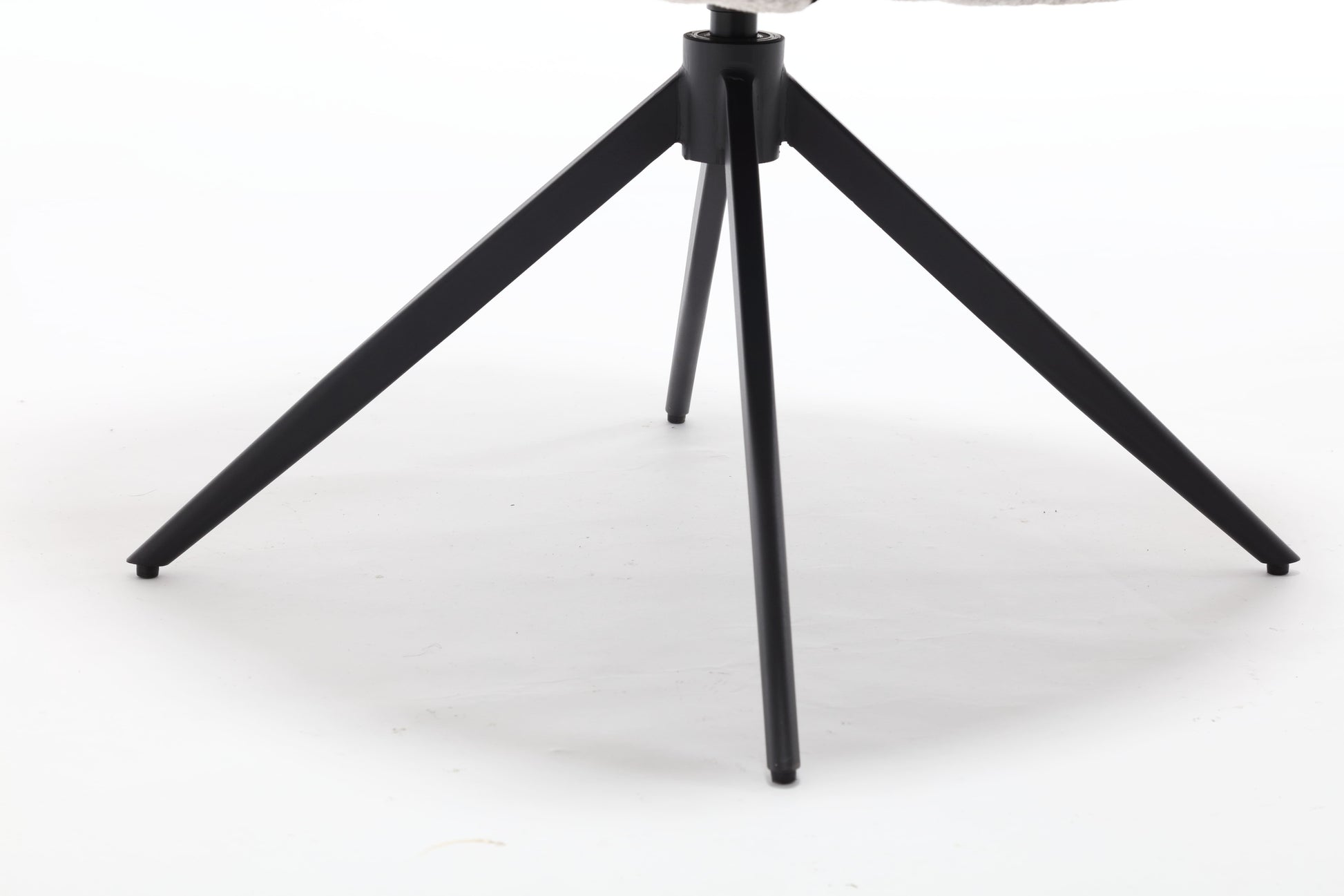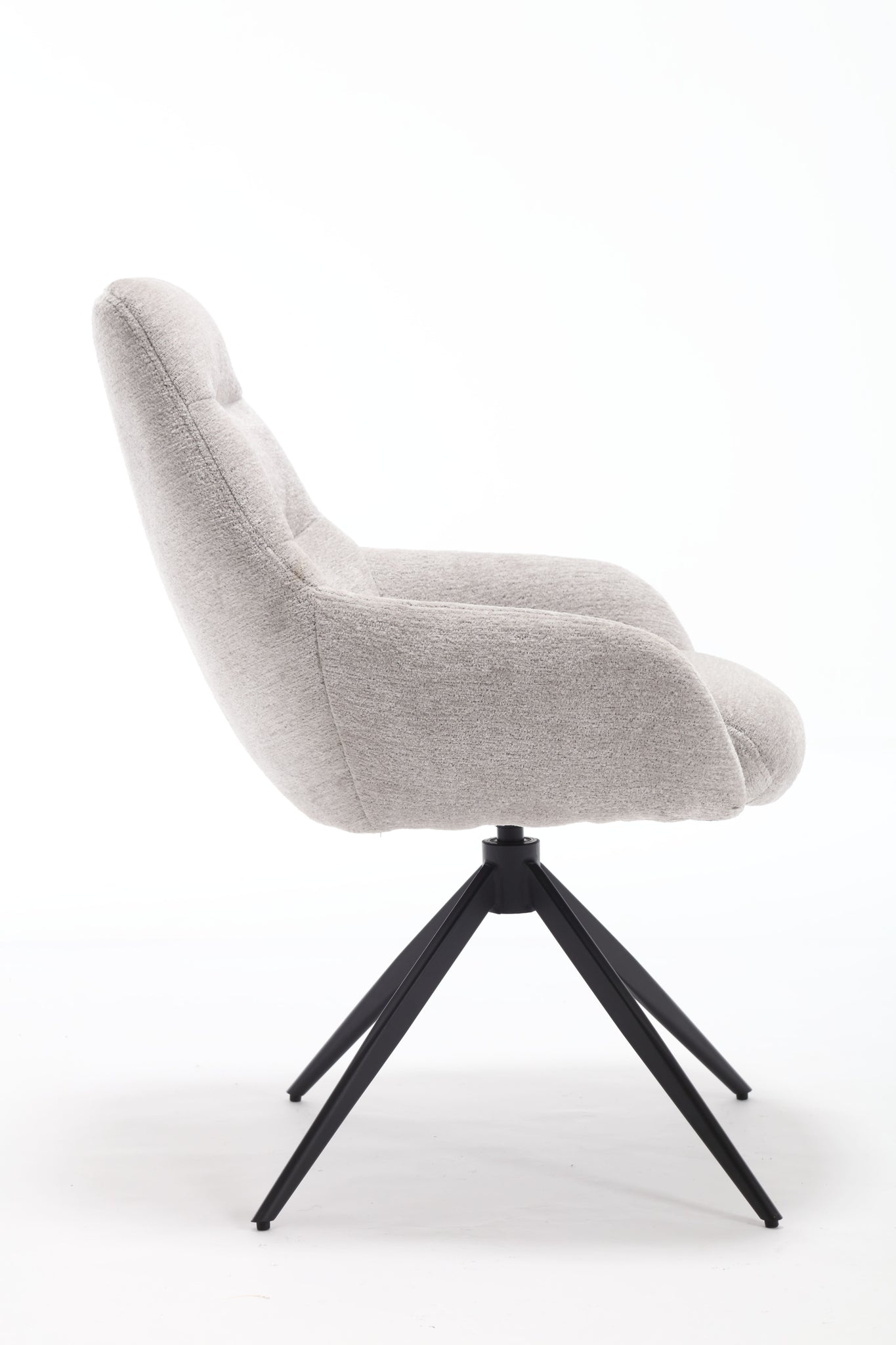 Het slanke, zwart gepoedercoate onderstel vormt een elegant contrast met de lichte bekleding en versterkt de moderne uitstraling van de stoel.