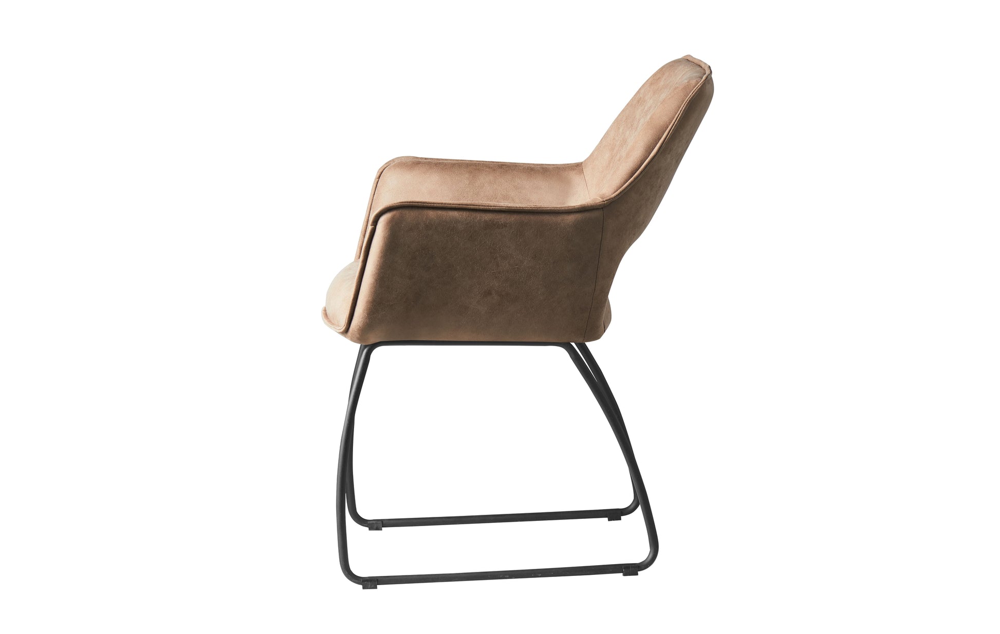 Het slanke zwarte metalen frame biedt stabiliteit en contrasteert mooi met het bruine suède. Het sledeontwerp geeft een moderne touch.