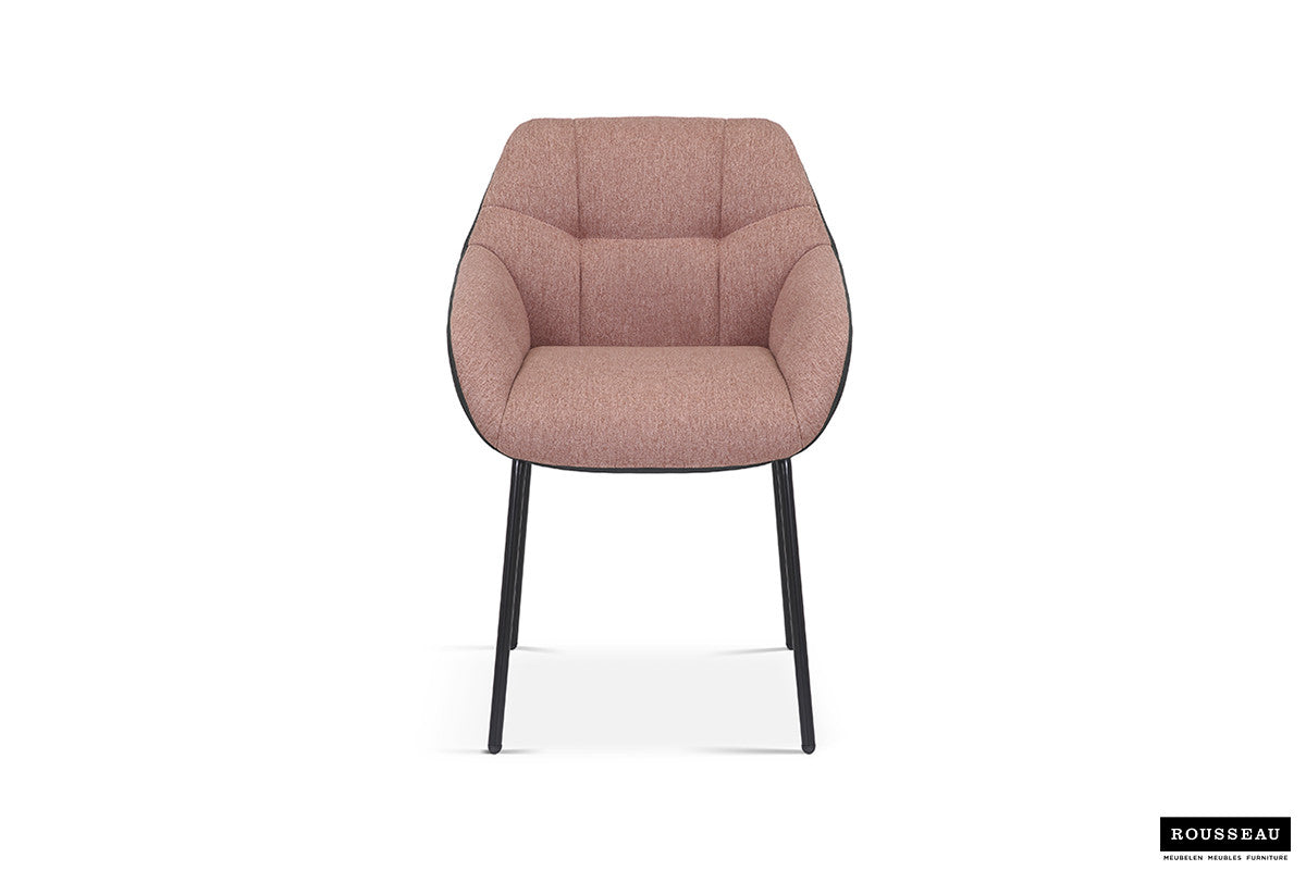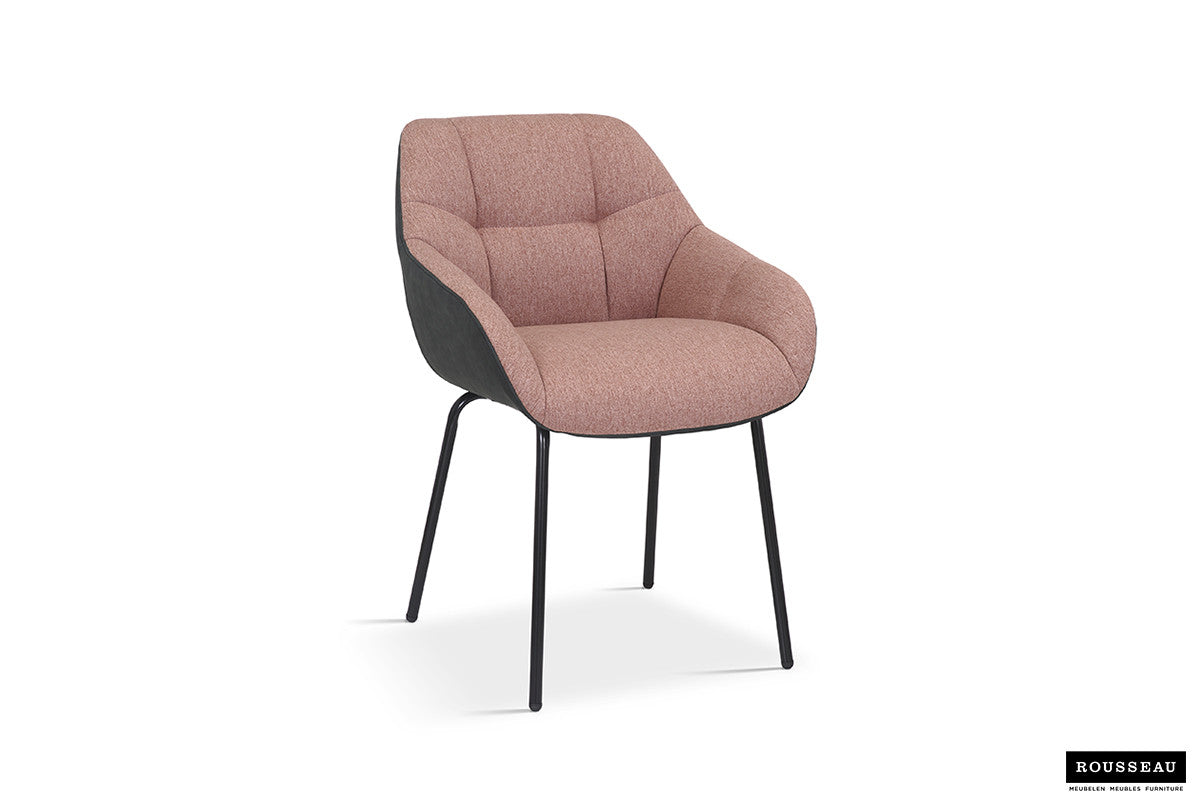- Kleur en materialen: Zitting van roze stof voor een warme, uitnodigende uitstraling; rugleuning in donkergrijs PU-leer voor contrast en onderhoudsgemak.