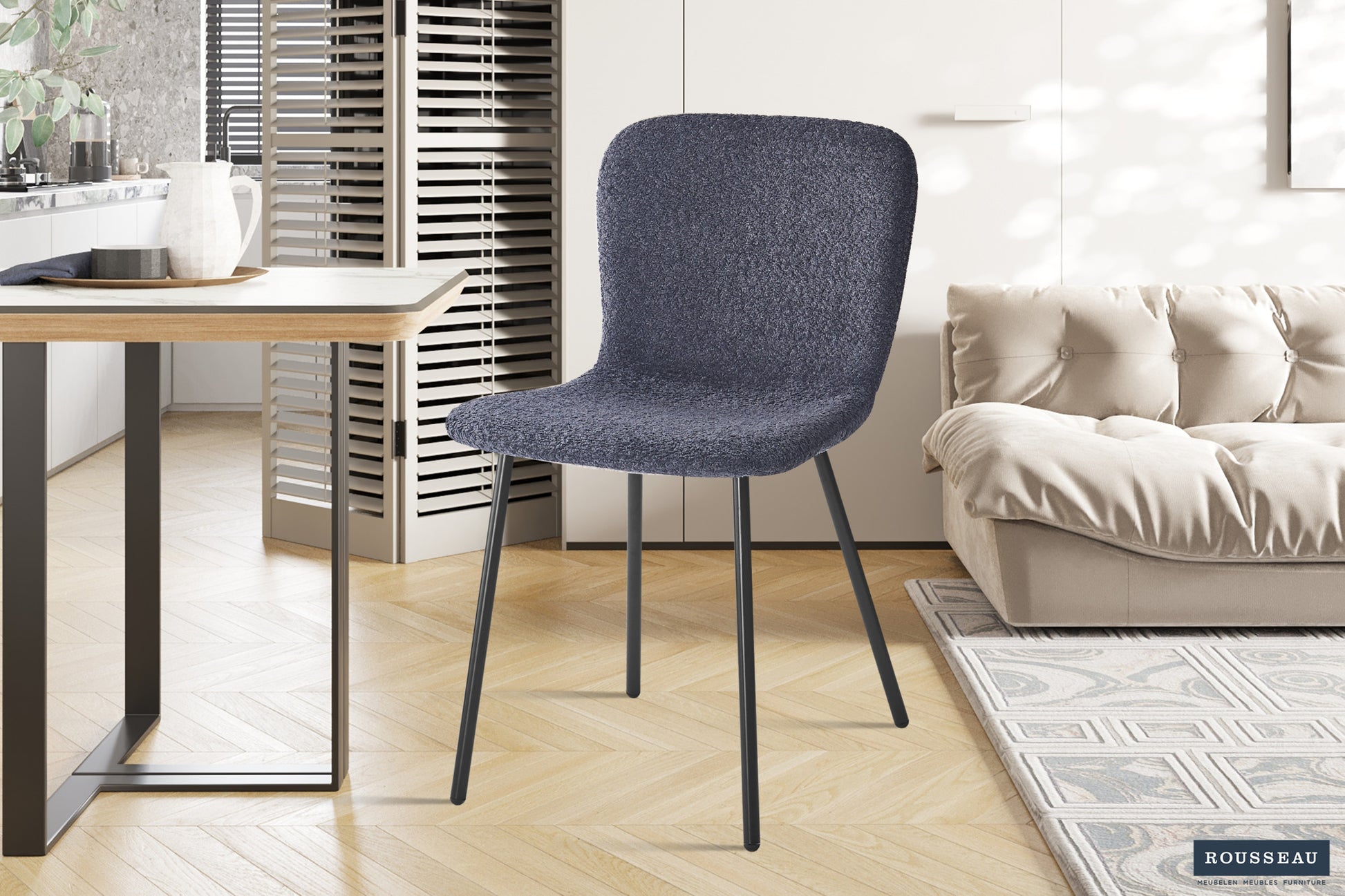De combinatie van bouclé textuur en een neutrale donkergrijze kleur zorgt voor een tijdloze uitstraling die gemakkelijk te combineren is met houten tafels, metalen accenten en uiteenlopende kleurpaletten. Dankzij het compacte formaat past de stoel in kleinere ruimtes zonder de zaal te domineren, terwijl hij toch voldoende zitcomfort biedt voor korte eettaferelden of lange werk- en studeersessies.